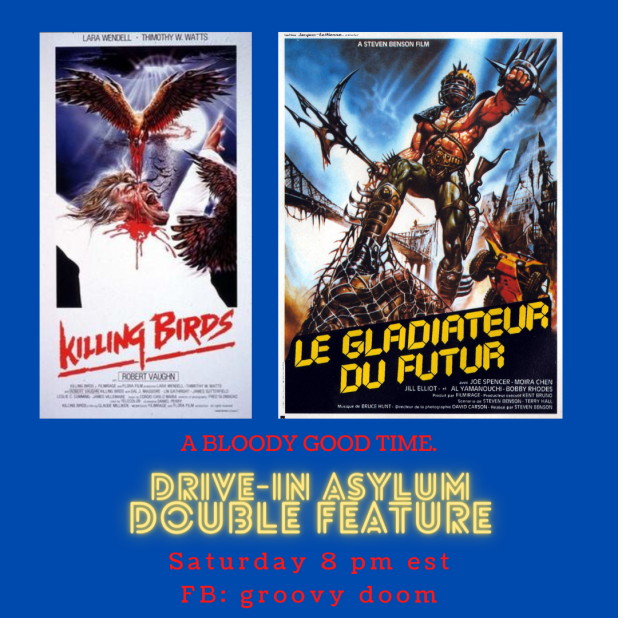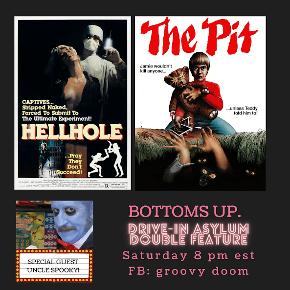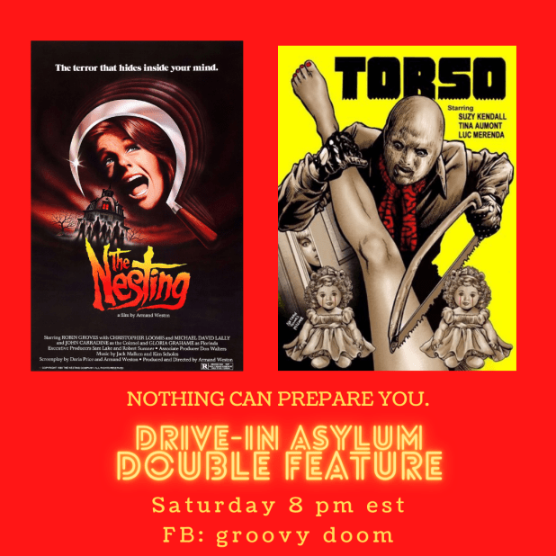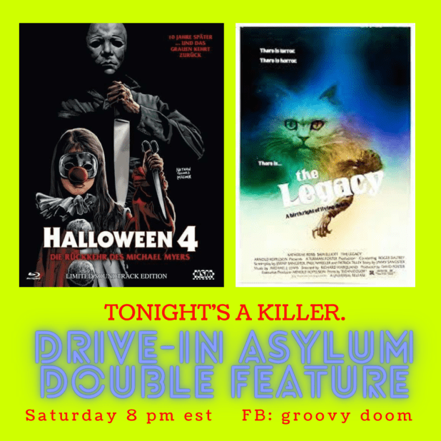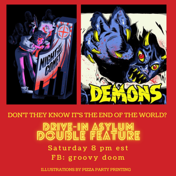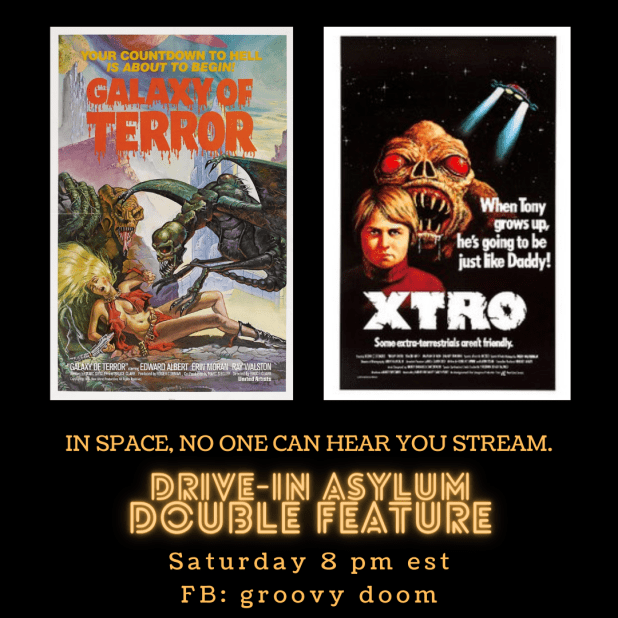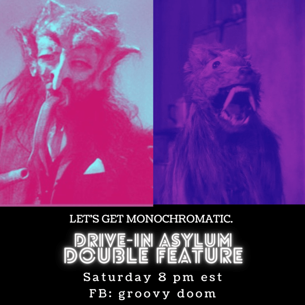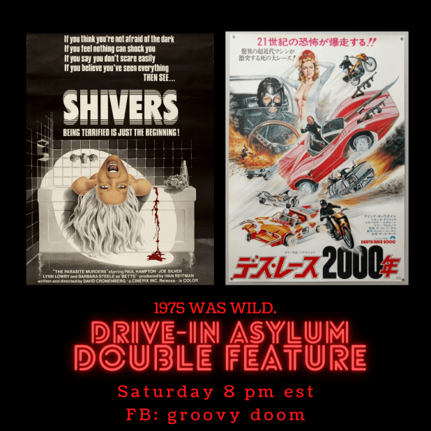 Let’s pretend that it’s 1975 and we’re going to the drive-in for real this week! Join us Saturday on the Groovy Doom Facebook page starting at 8 PM East Coast Time. Just a reminder — we introduce the films, give you a drink recipe, show you ads for the film and then you watch it on your own, then come back for the next movie and wrap up!