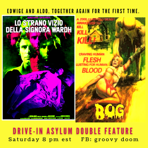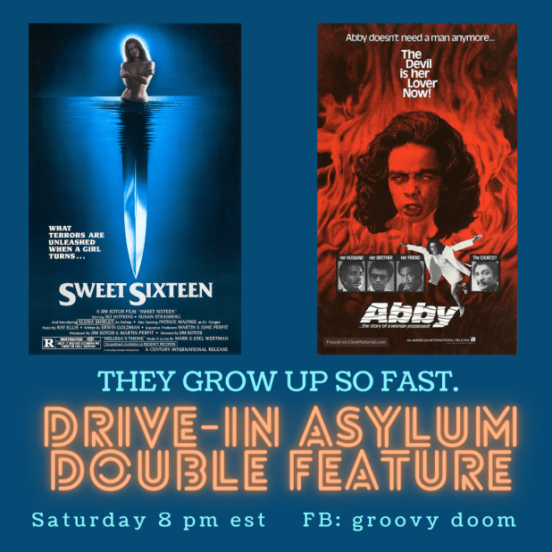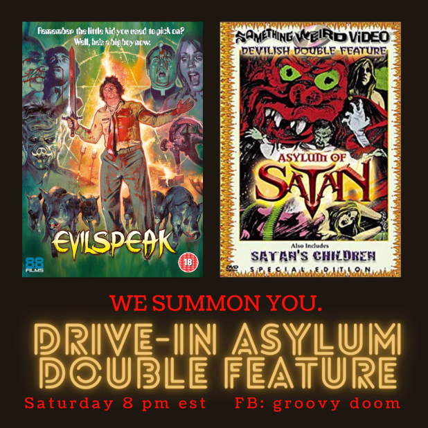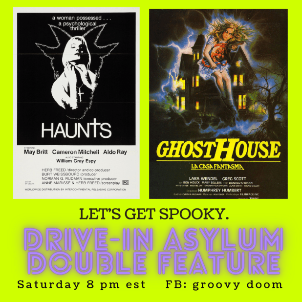We’re so excited that so many of you come and watch movies with us every Saturday night. If you’re up for a late night of watching and talking all things fantastic film, visit with us on the Groovy Doom Facebook page at 8 PM East Coast Time.
