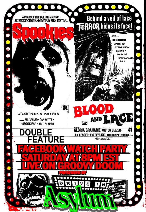 This Saturday night, join Bill Van Ryn and me LIVE here on Groovy Doom’s Facebook for the first ever Drive-In Asylum double feature watch party – late 80s monster freakout “Spookies” and 1971 PG-rated sickie “Blood and Lace” starring Gloria Grahame!