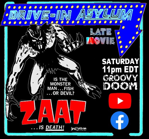 This Saturday at 11 PM ET, Bill and I are watching a movie with a lot of titles but you can call it Zaat. We’ll be on the Groovy Doom Facebook and YouTube channels to help you survive the chaos.