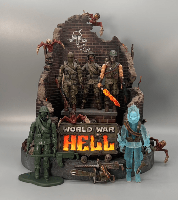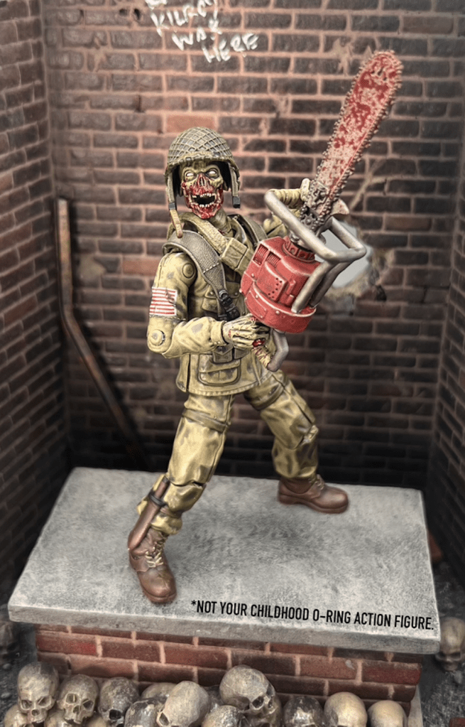 “World War HELL is a vintage-inspired 1/18 World War II horror O-ring action figure line. Combining the nostalgic fun of Friday nights at the video store, 3-3/4 action figures and ridiculously over-the-top low-budget horror movies. Featuring classic O-Ring construction with a twist. Extra articulation, killer sculpting, highly detailed interchangeable accessories, all with premium deco. Incorporating a VHS-style packaging design, every figure comes in a slipcase box that beautifully showcases the movie poster artwork. Our team has spent the last year and a half designing, sculpting, fabricating and painting to create these incredibly detailed prototypes.”