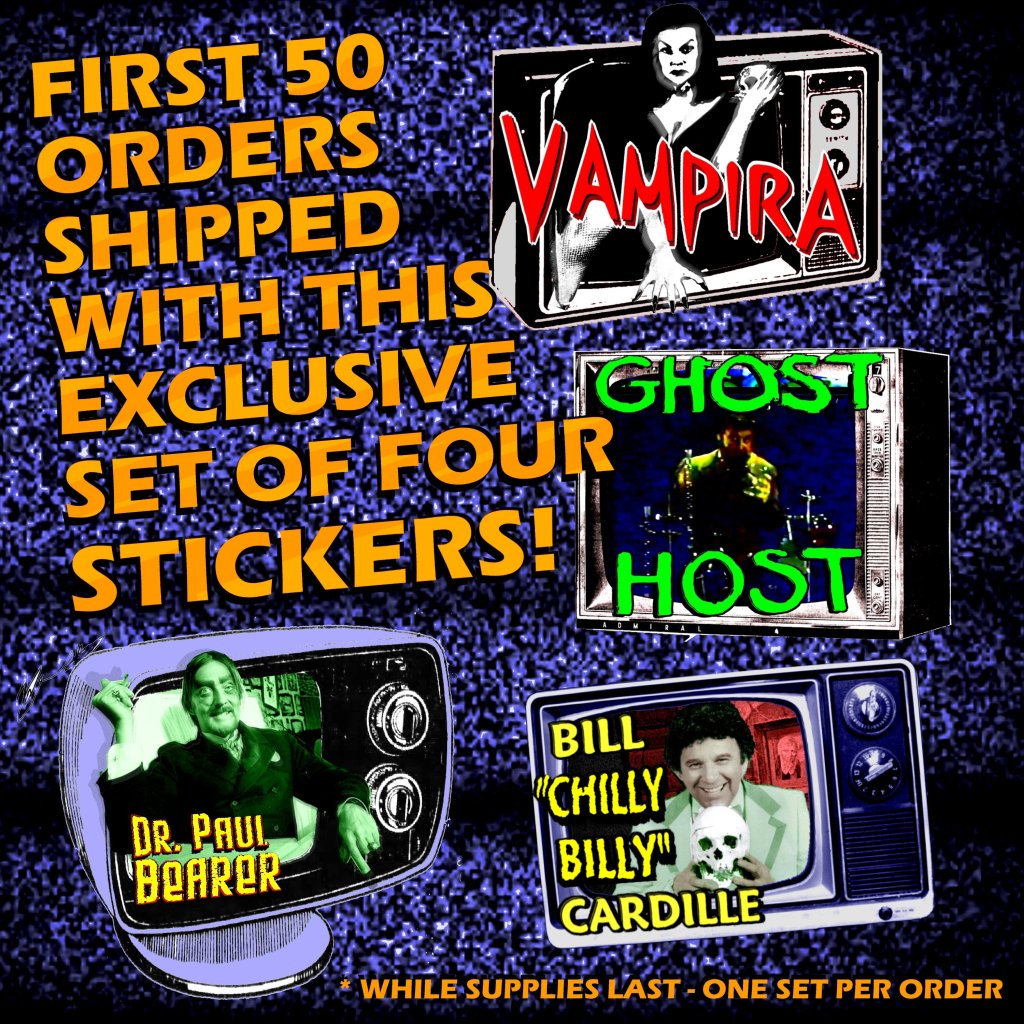 The first 50 orders will be shipped with a special set of four full-color horror host stickers (one set per order)!