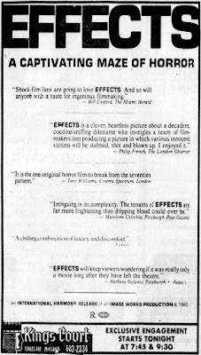 B&S: As someone who has watched hundreds of slashers, Effects was the first movie that made me consider, “Am I actually enjoying watching people die?” and “What if these deaths were real? They look real enough.”
