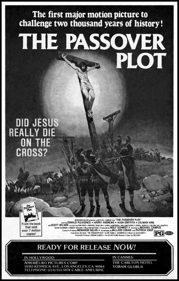 Hugh J. Schonfield was a British Bible scholar who specialized in the study of the New Testament and the early development of the Christian religion. I bet he never believed that when he went from being one of the original Dead Sea Scrolls team members and writing a non-ecclesiastical historical translation of the New Testament to writing The Passover Plot that it’d be made into a movie with Zalman King, Dan Hedaya and Donald Pleasence.
