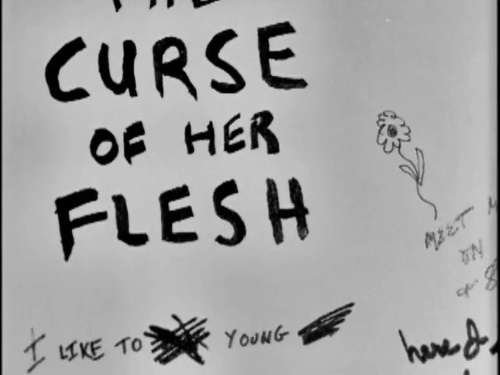 Paula Parkins (Jean Moorhead, Playboy Playmate of the Month for October 1955) might be the rich daughter of a newspaper editor and a socialite, but she gets her kicks by getting her galpals together and dressing like men to rob gas stations and terrorize lover’s lanes. In fact, they go so far as to assault a young man after tying up his girl Shirley. Yes, that was also Ed Wood’s cross-dressing alter ego name, which features prominently in many of his films. And yes, that woman side is being tied up so that the male side can be abused.