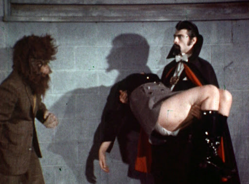 When this came out on VHS, it had Herschell Gordon Lewis introduce it and the name changed to Dr. Gore. In the credits, it also says that Patterson was America’s #1 magician, which seems like the kind of claim that can be verified. Also known as Shrieks in the Night, this movie is also evidence as to why Patterson died of metastatic malignant melanoma — his death certificate is linked on his IMDB page — because he’s lighting up in every scene, even when he’s in his lab. He also picks his nails with a scalpel, so there’s that.