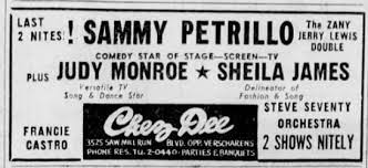 Petrillo and Mitchell broke up — on a much friendlier basis — around the same time as Martin and Lewis. Sammy worked for Randall’s Network Film Corporation, recorded novelty records, working with Doris Wishman on Keyholes Are for Peeping(Sammy and Chesty Morgan had the same agent) and eventually settled down in — of all places — Pittsburgh, where he had a dual life of running The Nut House comedy club, did a couples act with his girlfriend Suzie Fiore and was an MC at local gentlemen’s clubs.