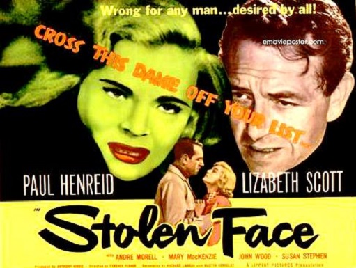 Stolen Face stars Scott in two roles. She’s concert pianist Alice Brent, who falls in love with plastic surgeon Dr. Philip Ritter (Paul Henreid) in spite of being engaged to a man named David (André Morell). When he loses her, Ritter transforms his patient, Lily Conover (Mary Mackenzie before the operation) into a clone of Alice and attempts to change her from living a life of crime. They marry but she is soon bored; he tells her that she has everything a woman could want and she yells, “What, do you want me to be on my knees all the time thanking you?”
