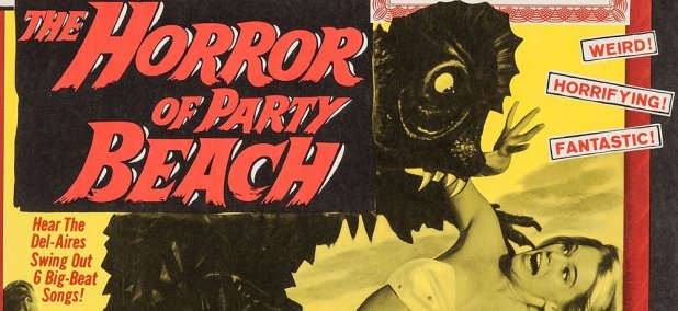 Shot in two weeks for $50,000 outside Stamford, Connecticut by local producer/director Del Tenney, The Horror of Party Beach was advertised as “The First Horror-Monster Musical.” Tenney would also direct I Eat Your Skin, a movie that we all know as the much worse half of the famous double bill with the utterly astounding I Drink Your Blood.