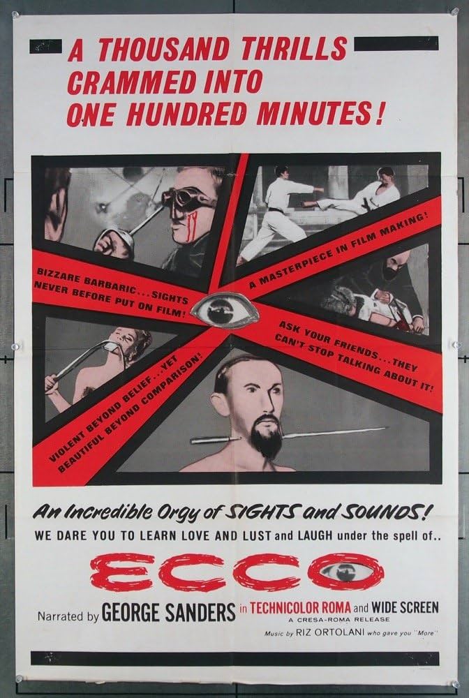 Ecco (1963): Offsetting the globetrotting shock of this film — watch a woman bite off a reindeer’s scrotum with her bare teeth! — is the voice of George Sanders, perhaps way too sophisticated a man for such an endeavor. That said, money is money, and it’s time for Gianni Proia to take us all around This Shocking World (the other title for this mondo).