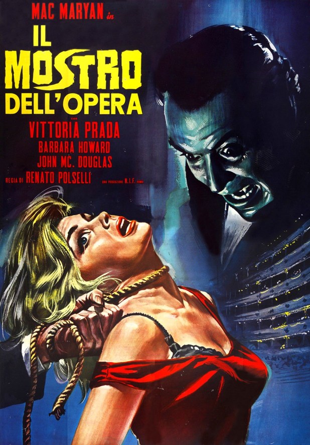 The difference in the few years in between movies is that now the dancers may embrace and even have a timid kiss between one another. Those that devour Polselli’s later films will giggle a bit at this; no corncob penetration here. For 1964, it had to be pretty titillating. So is the opening, in which the monstrous fiend in the opera chases a woman in a nightgown who is carrying the much-needed candelabra until he stabs her with a pitchfork.