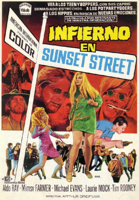 Filmed and released within four months of the late-1966 Sunset Strip curfew riots, this American-International Pictures film was directed by Arthur Dreifuss and written by Orville H. Hampton. It even has its own song, “Riot on Sunset Strip”, written by Tony Valentino and John Fleck of the Standells.