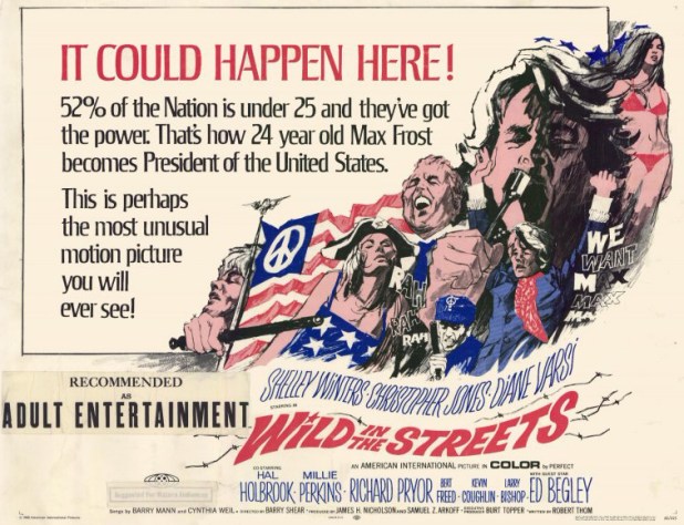 The Grand Old Party gets Max on their side, and he runs for President. Once he wins, he turns on them. Everyone over thirty must retire and be dosed on LSD for life in re-education camps. Fergus tries to bring Max’s parents in (Bert Freed and Shelley Winters) but feels nothing for them. His first political act was exploding their car. He even tries to kill the new President, who soon takes over and rounds up the Fergus family.