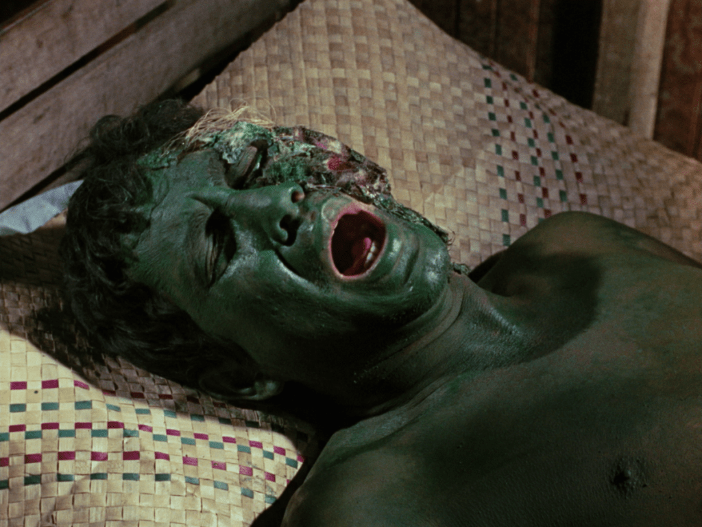 The film starts with an initiation, as at some theaters, you are given a packet of green liquid and asked to recite the oath of green blood so that you can watch the unnatural green-blooded ones without fear of contamination. Years later, Sam Sherman said that he came up with this idea, and he got incredibly sick when he drank one of the packets. The film’s other gimmick is rapidly zoomed in and out, like Fulci on speed, whenever a monster appears. That was to cover the harmful special effects, but it made plenty of theatergoers sick. Man — destructive green liquid and frequent pans and zooms. It’s as if they wanted kids to puke!