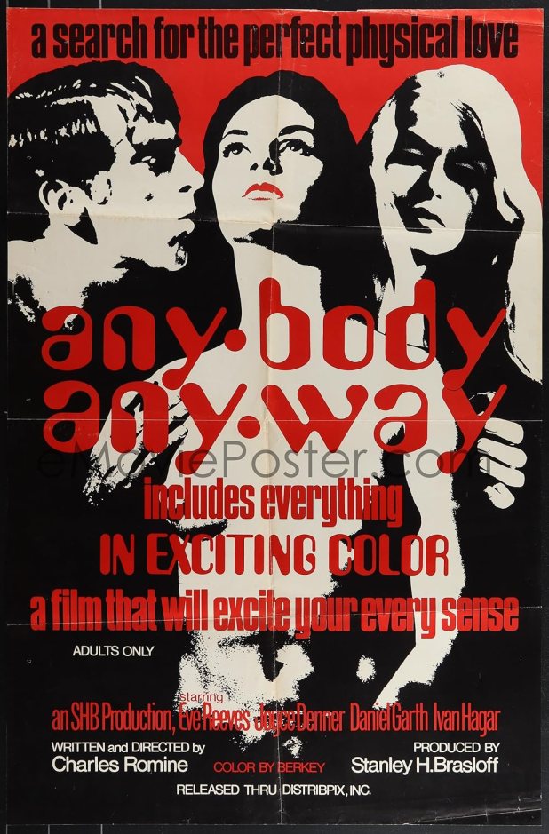 At least it has Arlene Martel in the cast. She was also Spock’s would-be wife, T’Pring, in the “Amok Time” episode. She also played a character named Adultress 58 in Battlestar Galactica, and if that’s not a great band name, I have no idea what is. She also shows up in Dracula’s Dog, Bunny Yeager’s Nude Camera and Chatterbox! And if you were a ’90s hipster, you should know Von Dutch did the opening titles and murals.