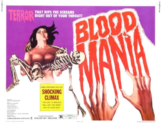 (From Wikipedia) Blood Mania is a 1970 American horror film written by Peter Carpenter and Tony Crechales and directed by Robert Vincent O’Neil, and starring Carpenter, Maria De Aragon, Vicki Peters, Reagan Wilson, Jacqueline Dalya, and Alex Rocco. The film stars Carpenter as a doctor whose mistress, an heiress, murders her terminally ill father to help him pay off a debt.