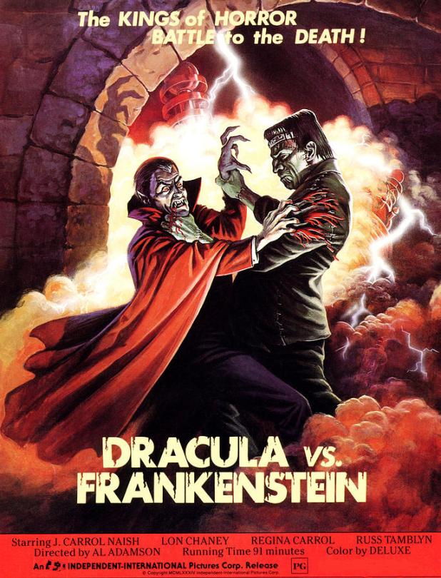 Dracula vs. Frankenstein feels like the most Independent-International movie there is. I have no other way to explain why this movie seems like it came from another reality. It has Dr. Durea (J. Carrol Naish, in his last movie), the last descendent of Dr. Frankenstein, killing women with his assistant Groton (Lon Chaney Jr. in his next to last movie) to try to come up with an elixir that will fix his legs and his henchman’s simple brain. They’re visited by Dracula (Zandor Vorkov, really Raphael Peter Engel, given that name by Forrest J. Ackerman and someone who once ran record stores; according to this interview in Fangoria, he’s wearing a rental cape that was once used by Bela Lugosi) who wants them to finish their cocktail so that it can allow him to walk in the daytime which he feels will make him finally able to take over the world.