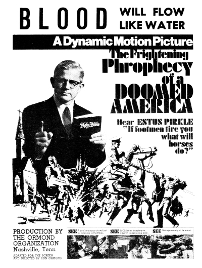 The disturbing thing is, Ormond actually toned down Pirkle’s hysterical tendencies for the film. In the audio recording of the original sermon, posted on YouTube, Pirkle goes on at much greater length about the dangers of the “footmen.” In one segment, he contrasts the virtuous content of the McGuffey Reader, a nineteenth-century teaching aid that he and his father grew up with, which consisted heavily of Bible stories, and the New Our New Friends reader being used in schools of his day He dismisses the latter as being full of “Jack and the Beanstalk stuff” while claiming that one of its stories, about a squirrel receiving a nut from a little boy in a white house, was meant to indoctrinate children into socialism. To put Pirkle’s rant into perspective, the New Our New Friends reader featured the well-known “Dick and Jane” stories. Ormond even apparently persuaded Pirkle to alter the delivery of his sermon; in the original recordings, the reverend’s voice often developed a shrill quality when he got excited.