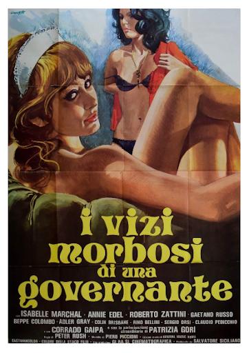 Sure, that’s a pretty lurid title — the Italian title I vizi morbosi di una governante translates as Morbid Vices of a Housekeeper — and trust me, this lives up to it, what with an older woman using a mentally challenged man and a teenager sexually — not at the same time! — and then a game of charades which is mostly people yelling out the names of films while everyone else gropes one another.