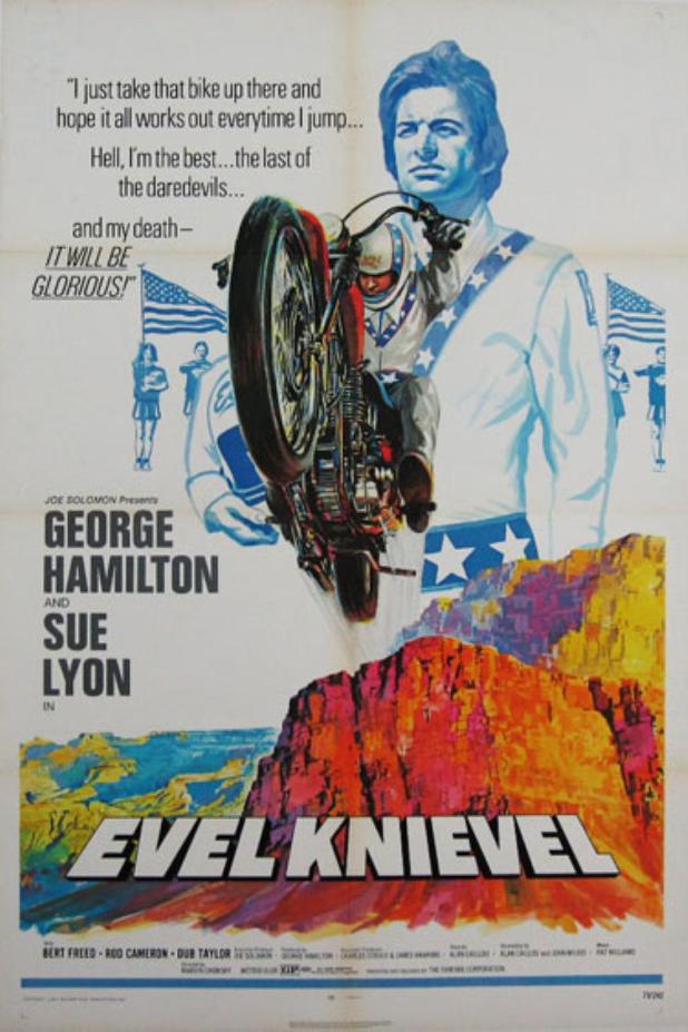 The film begins with Evel — played by George Hamilton — giving a speech directly to us, the viewer: “Ladies and gentlemen, you have no idea how good it makes me feel to be here today. It is truly an honor to risk my life for you. An honor. Before I jump this motorcycle over these 19 cars — and I want you to know there’s not a Volkswagen or a Datsun in the row — before I sail cleanly over that last truck, I want to tell you that last night a kid came up to me and he said, “Mr Knievel, are you crazy? That jump you’re going to make is impossible, but I already have my tickets because I want to see you splatter.” That’s right, that’s what he said. And I told that boy last night that nothing is impossible. Now they told Columbus to sail across the ocean was impossible. They told the settlers to live in a wild land was impossible. They told the Wright Brothers to fly was impossible. And they probably told Neil Armstrong a walk on the moon was impossible. They tell Evel Knievel to jump a motorcycle across the Grand Canyon is impossible, and they say that every day. A Roman General in the time of Caesar had the motto: “If it is possible, it is done. If it is impossible, it will be done.” And that, ladies and gentlemen, is what I live by.”