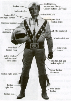 This led to an obsession with jumping more things — like cars — and the unfortunate side effect of getting hurt nearly every time. He crashed around twenty times — huge, incredibly violent crashes — and his Guinness Book of World Records entry states he suffered 433 bone fractures by the end of 1975.