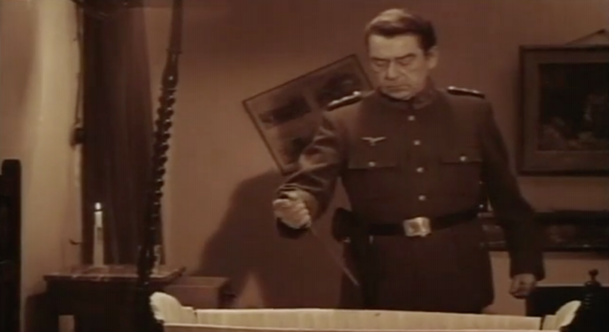The film opens at the end of WWII during a bombing raid. A Baron’s wife has just given birth and died immediately after. The Baron orders the servants out of the house for safety and murders his newborn daughter in her cradle. The scene – shocking even by today’s standards – uses a real baby in the special effect. A good way to grab the audience’s attention for sure.