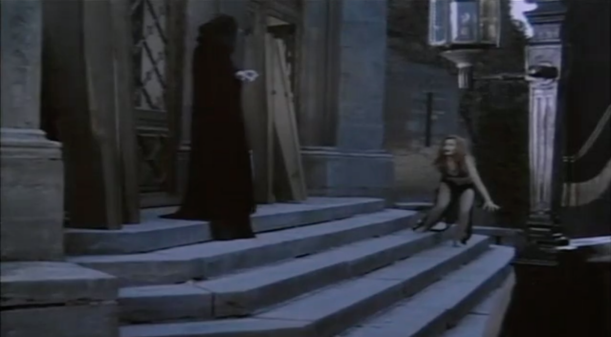 There are two trailers available: The Italian version, while nicely cut and more “stylish,” it looks like it’s promoting an episode of TV’s Columbo—with an occasional splash of a full-frontal and a web-strewn crypt. The American trailer cheeses it up a bit, but at least shows Evelyn isn’t a G-rated American detective romp, but the Giallo-gothic screw turner we know and love.