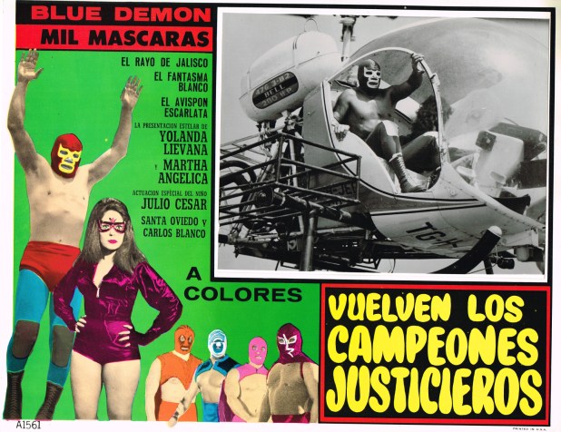 Luckily, humanity has El Rayo de Jalisco (who didn’t appear all that often in movies), Mil Máscaras and Blue Angel* (who would team with Superzan and Tieneblas to fight a very similar set of bad guys in the following year’s El Castillo de las Momias de Guanajuato) are on our side.