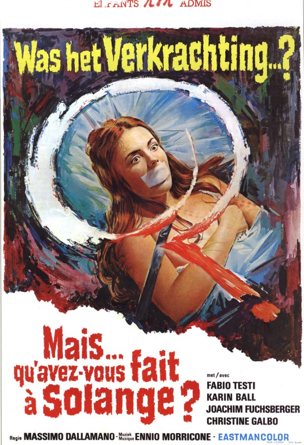 I always love seeing what titles films get released and re-released under. What Have You Done to Solange? has so many, including an attempt to sell it as a teen comedy entitled The Rah-Rah Girls! You can learn more at the amazing Temple of Schlock site. And for an awesome police report of the events of the film, head to The Giallo Files.