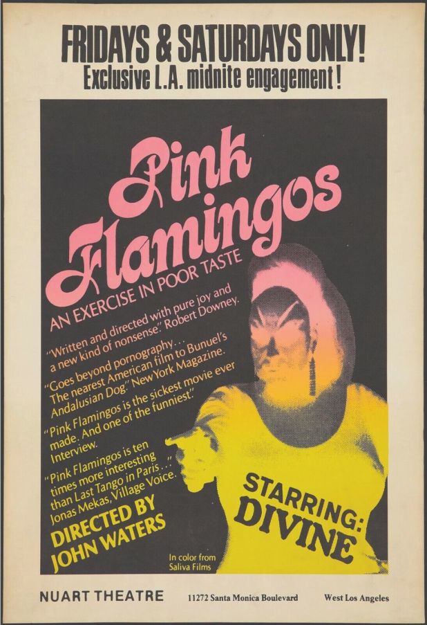 A movie that has the dedication “For Sadie, Katie, and Les- February 1972” — Manson Family members Susan Atkins, Patricia Krenwinkel and Leslie Van Houten discovered in February 1972 that the death penalty was abolished in California, reducing their sentences — director and writer John Waters and star Divine announced themselves to the world here, despite already making the movies Hag in a Black Leather Jacket, Roman Candles, Eat Your Makeup, Dorothy, the Kansas City Pot Head, Mondo Trasho, The Diane Linkletter Story and Multiple Maniacs, films that didn’t escape Baltimore and small screenings.