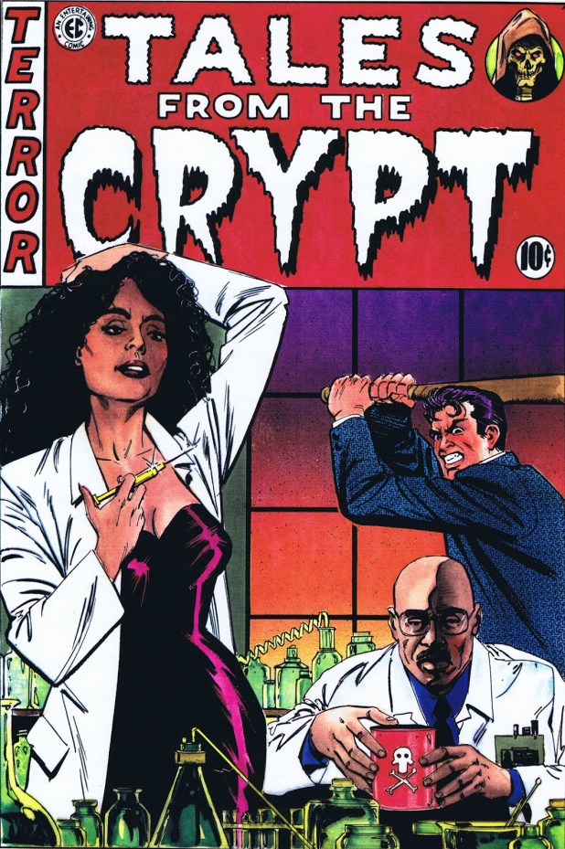 “Damn! I love when that happens! You didn’t know your old friend the Crypt Keeper was the boo-it-yourself type, did you? I’m actually pretty handy with my little ghoul box. Here’s a bookshelf I just finished for my die-brary. Over there’s a stand I made for my new big scream TV! (the camera pans to the stand, where the TV shows the Crypt Keeper waving at the viewers; cut back to his original view) And here’s something else I’ve been working on. It’s a nasty nugget about an unpleasant young man in the medicine biz who’s about to get a dose of his own. I call tonight’s tale: “This’ll Kill Ya.””