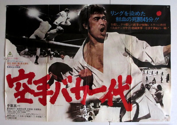 Karate for Life (Karate Baka Ichidai which means A Karate Crazy Life) is the third and final movie in Sonny Chiba and director Kazuhiko Yamaguchi’s series of movies about Kyokushin Karate master Mas Oyama. They’re based on the Karate Baka Ichidai manga that was drawn by Jirō Tsunoda and Jōya Kagemaru and written by Ikki Kajiwara. That comic book and the anime led to a karate boom in Japan and the artwork inspired the Street Fighter series and definitely is why you fight a bull in Karate Champ.