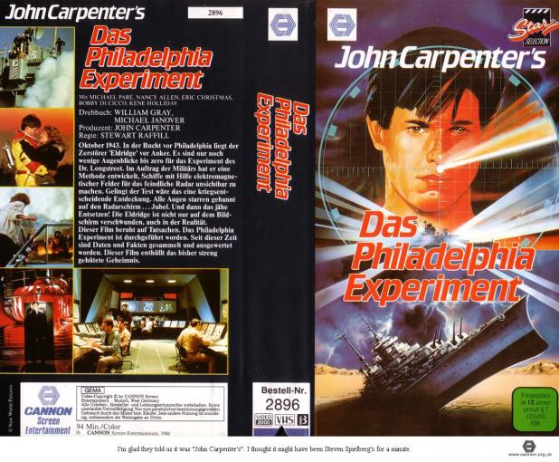 EDITOR’S NOTE: This was originally on the site on June 1, 2022. It was not produced by Cannon, but was released on video in Germany by Cannon Screen Entertainment, who called it John Carpenter’s Das Philadelphia Experiment.
