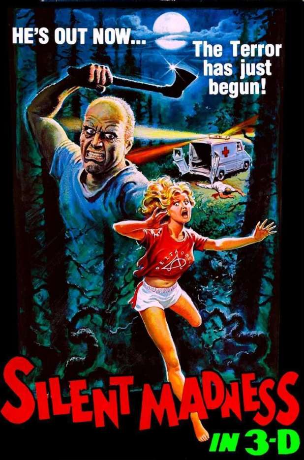 Shot with the ArriVision 3-D camera system, Silent Madness wasn’t just late to the 80’s 3D revival, it was late to the slasher madness too. It was directed by Simon Nuchtern, president of August Films. He brought over plenty of foreign films and had them re-edited for American tastes, like the film that the Findlays shot in Argentina called TheSlaughter, which was released as Snuff. He also brought Karate Kiba to U.S. theaters with a new open and called it The Bodyguard and that’s why we call marijuana chiba, as well as directing New York Nights and Savage Dawn.
