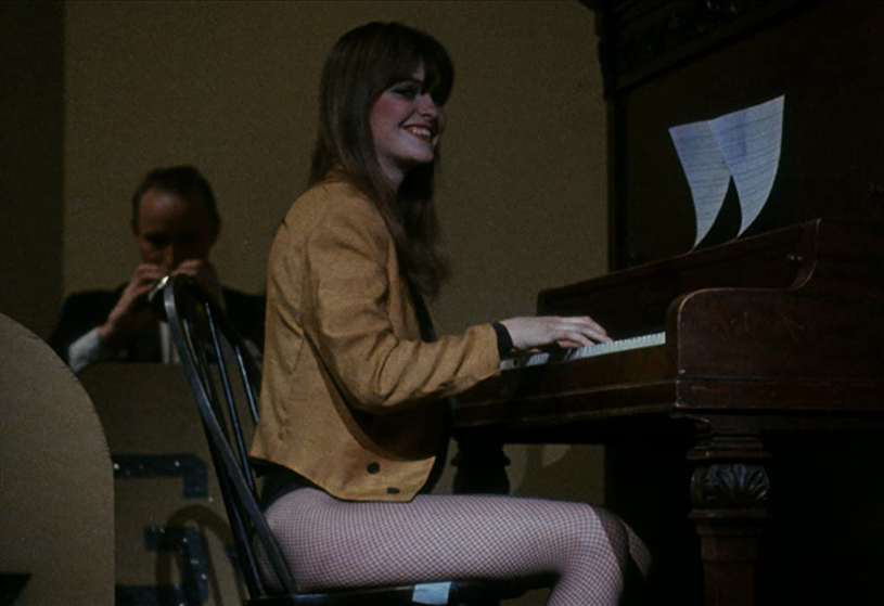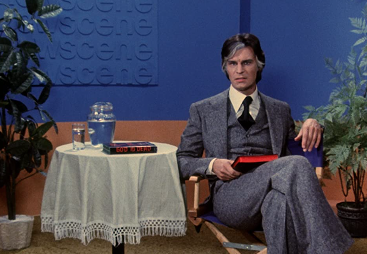 Unlike those films, which just jams the stories together, the stories here are linked by a framing sequence of a band that’s traveling through the night on, well, a night train to terror. All the while, God (Ferdy Mayne, last seen as Count von Krolock from The Fearless Vampire Killers, who felt this movie was so poor that he penned a letter to its director) and Satan (Tony Giorgio, who wasn’t just Bruno Tattaglia in The Godfather but the Playboy Club’s in-house gambling expert. He’s also the sheriff in another film that may possibly melt your mind, the Bigfoot-centric Cry Wilderness) are just a few cars down, debating whether or not the band will live to see their next destination. Meanwhile, the night porter makes faces at the camera years before single camera shows like The Office and Curb Your Enthusiasm made such mugging de rigueur.