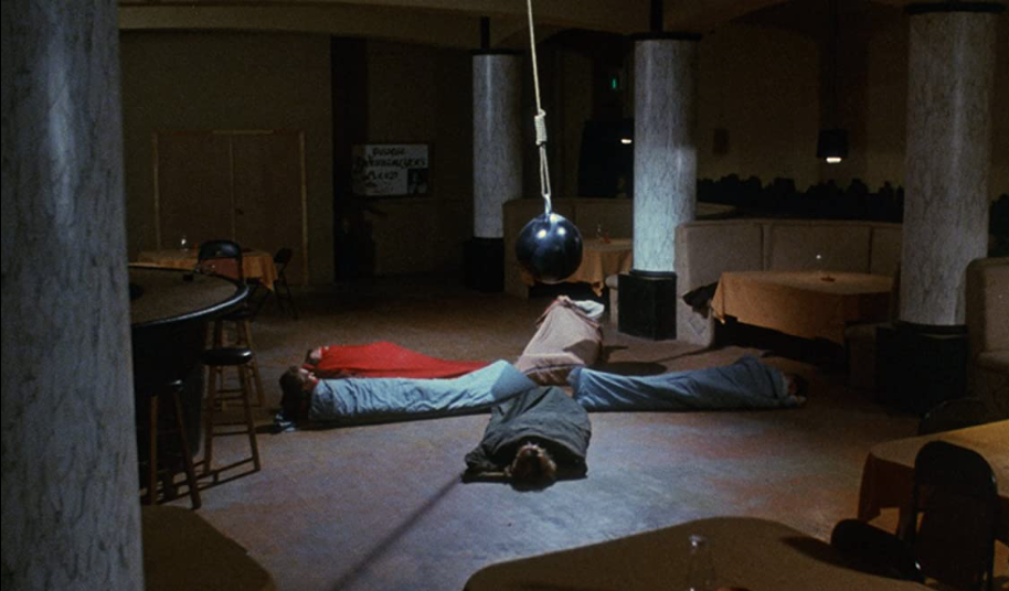 One day, a college guy named Glen (Rick Barnes) sees the girl — Gretta — on a stag loop and falls in love, eventually finding her and starting a relationship, which leads her old Hollywood producer sugar daddy husband to bring him into a suicide club. This club has a baroness and a guy who looks and acts like Jimi Hendrix, all playing games like letting a giant claymation beetle fly around and sting one of them to death or lie in sleeping bags until a giant ball crushes one of them. Back to Jimi — he’s electrocuted as he yells song lyrics.