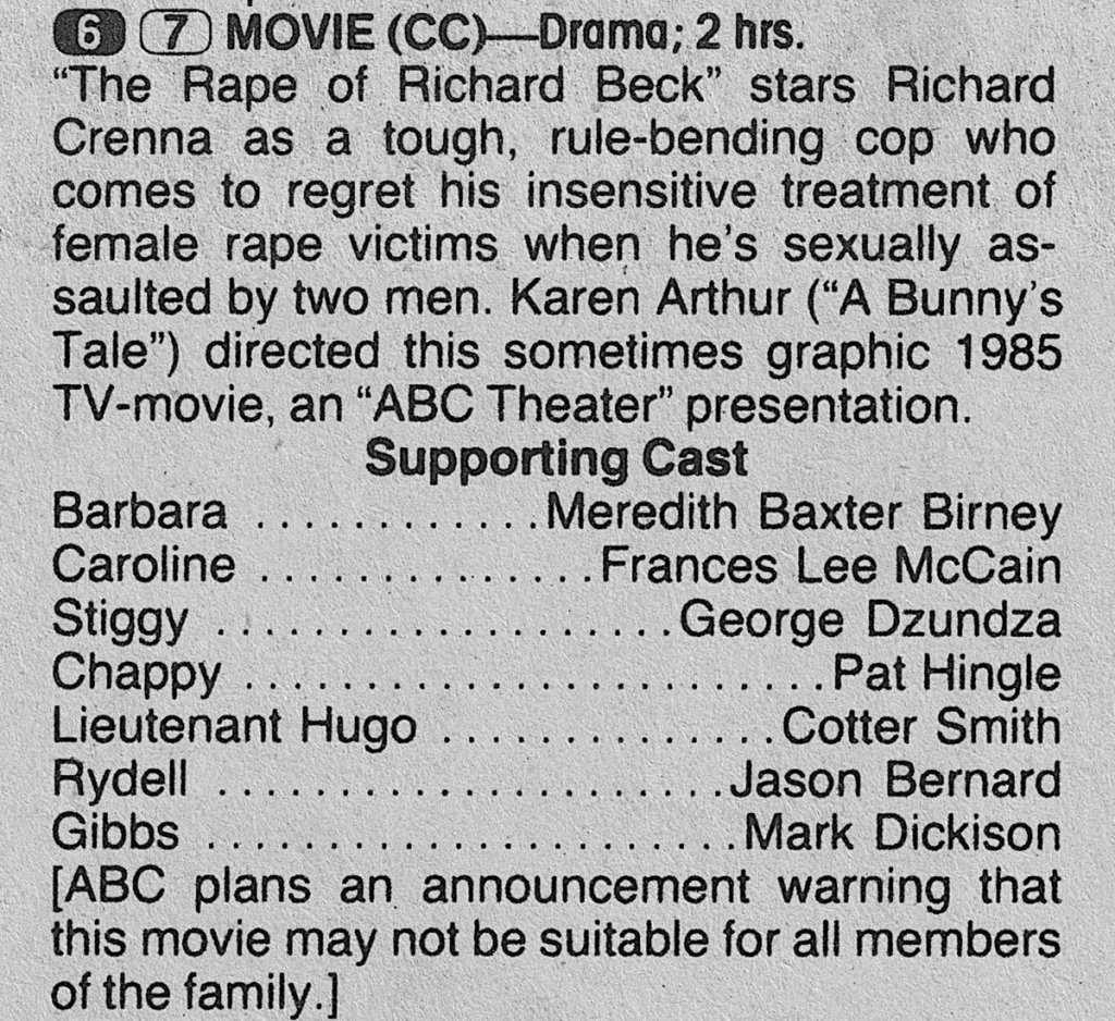 Crenna plays Richard Beck, a jocular homicide detective with a mean streak towards rape victims. Like many police officers back then – and far too many now – Sergeant Beck regards rape as a less important crime that victims bring upon themselves. When Beck allows a rape suspect to go free in exchange for information about the whereabouts of a murderer, he is forced to join the sex crimes unit, where his insensitivity comes to the fore, to the disgust of a community representative played by Meredith Baxter.