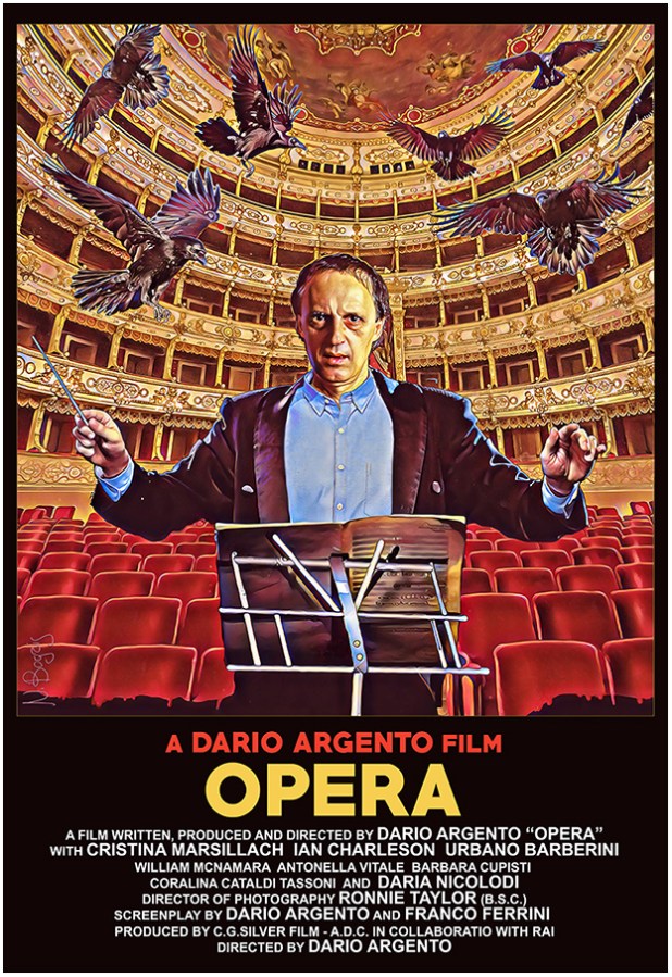 Because Alicia left, the director fires her while Betty is killed with a pickaxe outside. Alicia finds the body and calls the police (one of them is Soavi, who spends an extended scene asking if he looks like James Dean), who lock them inside the theater and guard the premises. Because, you know, that’s the way the police handle these things.