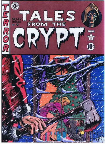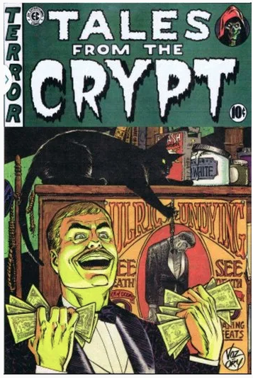 EC publisher William Gaines and editor Al Feldstein loved horror, so they published a story called “Return from the Grave!” in the comic Crime Patrol #15. This was the first appearance of the Crypt-Keeper and a few issues later, the title became The Crypt of Terror — in my high school art club, this is what we named our haunted house and yes, it totally was an EC Comics reference, I was the hugest nerd — and then took on its real title a few issues afterward.