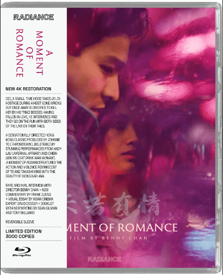 Limited edition of 3000 copies, presented in full-height Scanavo packaging with removable OBI strip leaving packaging free of certificates and markings, the Radiance Films blu ray release has a 4K restoration of the film from the original camera negative, as well as an archival audio interview with Benny Chan; In Love and Danger: HK Cinema Through A Moment of Romance, a new visual essay by critic and Asian cinema expert David Desser; commentary by Asian cinema expert Frank Djeng; newly translated English subtitles by Dylan Cheung; a trailer; a reversible sleeve featuring original and newly commissioned artwork by Time Tomorrow and a limited edition booklet featuring new writing on the iconic cast and crew by critic Sean Gilman and a profile of Benny Chan by Tony Williams, co-editor of Hong Kong Neo Noir. You can get it from MVD.