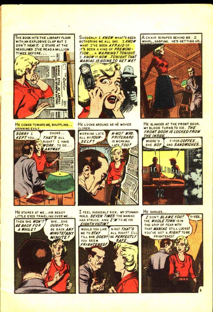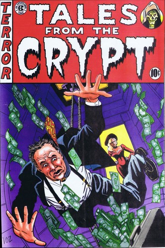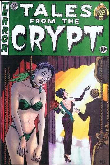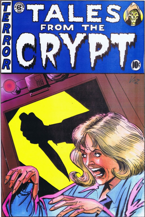 “Oh, hello kiddies! Tonight’s coffin caper is so crammed with ghastly greed, sickening sex, and vomitous violence, that parental guidance is advised. So… guide your parents out of the room, so we can have some fun! (cackles) This tale concerns a gambling man with a bad case of double vision, who’s about to hit the hack-pot. I call this twin helping of horror “Split Personality.””