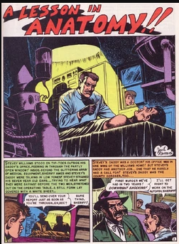 This episode isn’t based on an E.C. Comic story. However, the story “A Lesson in Anatomy!!” was in Weird Fantasy #12. The plot is sort of close. “Chased away from his father’s lab while he dissects a body, Stevey finds a stranger in the forest. Wanting to brag, Stevey tells the man all sorts of falsehoods, which he believes; But Stevey soon learns a secret about the stranger he doesn’t expect to discover.” It was written by William Gaines and Al Feldstein and drawn by Jack Kamen.