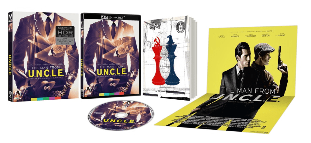 The Arrow Video release of The Man from U.N.C.L.E. has plenty of extras, including new audio commentary by critics Bryan Reesman and Max Evry; new interviews with co-writer/producer Lionel Wigram and Luca Calvani; Legacy of U.N.C.L.E., a new featurette celebrating the original 1960s TV series and its influence on the 2015 movie, featuring Helen McCarthy, David Flint and Vic Pratt; a featurette on Guy Ritchie’s films; archival features on the making of the movie; a trailer; an image gallery; a double-sided fold-out poster featuring original and newly commissioned artwork by Dare Creative; an illustrated collector’s booklet featuring new writing by Barry Forshaw and a reprinted article from CODEX Magazine on the film’s cinematography and a reversible sleeve featuring original and newly commissioned artwork by Dare Creative. You can order it from MVD in 4K UHD or Blu-ray.